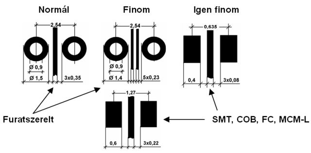 2. ábra. Különböző rajzolatfinomságú nyomtatott huzalozások