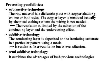 The subtractive technology uses copper clad laminates and subtracts the unnecessary pattern of copper layer from the surface by etching. In the course of the additive technology the wiring pattern is deposited physically, chemically or mechanically onto the originally insulating surface of the board. There is also a combination of the two processes, the semi-additive process.