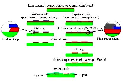 For single-sided boards the simple masking and etching technique can be used. Starting with a copper clad laminate, the pattern of the wiring is screen printed onto the surface as a positive mask. Alternatively photoresist technology can also be used to make the same mask, but the much cheaper screen printing is sufficiently good for the rough resolution of common single-sided boards. From the uncovered places the copper foil is removed by etching, then the mask layer is stripped, and in the last step the holes are drilled.